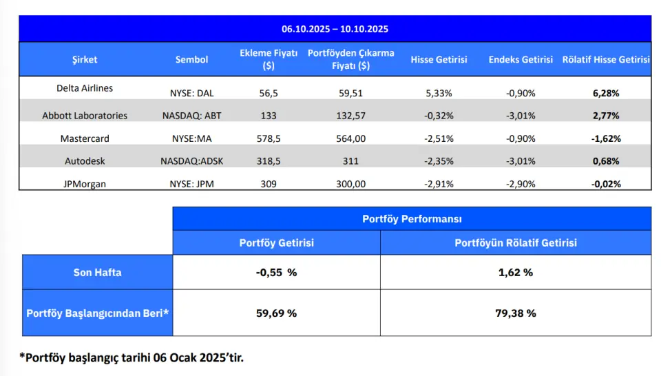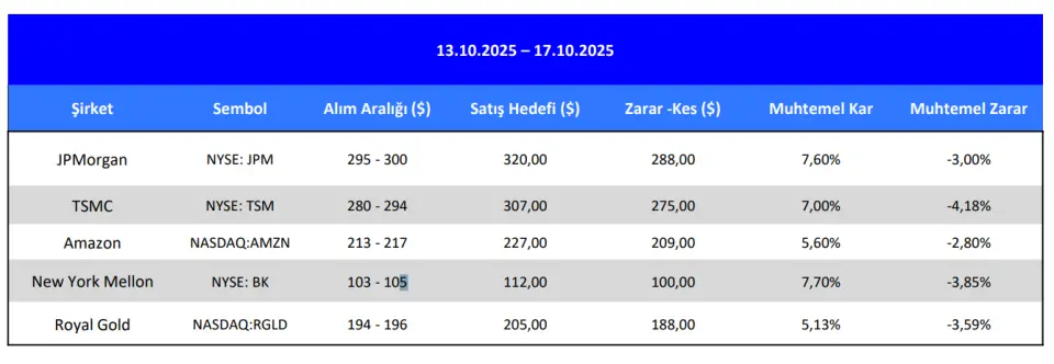 Gedik Yatırım 13 Ekim 2025 tarihinde bir rapor yayınladı. Aracı kurum Uluslararası Piyasalar Haftalık Model Portfolyo'yla yayınladı. 13 Ekim ve 17 Ekim haftası için 5 adet Uluslararası Piyasalardan hisse için hedef fiyat verdi. Bu hisseler JPMorgan, TSMC, Amazon, New York Mellon, Royal Gold oldu. Bazı hisseler Nasdaq endeksinde yer alırken bazıları yer almadı.