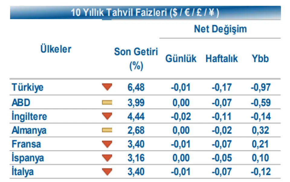 Gün içinde ABD 10 yıllık gösterge tahvil faizi 3,99, Almanya 10 yıllık gösterge tahvil faizi %2,68 seviyesinde işlem gördü. Türkiye’nin 5 yıllık Dolar cinsi CDS risk primi 239 bp seviyesinde işlem görürken, Ocak 2035 vadeli 10 yıllık Eurobond faizi 1 bp azalışla %6,48 seviyesinden işlem gördü. Döviz tarafında, majör para birimleri ABD Dolar’ı karşısında karışık seyir izledi. Dolar Endeksi 99,681 seviyesine yükselirken, Euro / Dolar paritesi 1,1571 seviyesine geriledi.