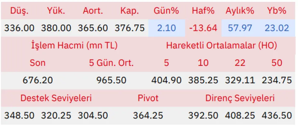 Gün içinde en düşük 336.00 en yüksek 380.00 seviyesini gören Kiler Holding hissesinin günü %2.10 kazançla tamamladığı gözlenmektedir. Pivot seviye 364.25 seviyesinden geçmekte olup, aşağı yönlü hareketlerde birinci destek 348.50, ikinci destek ise 320.25 seviyesinden geçmektedir. Dirençler ise sırasıyla 392.50, 408.25 seviyelerinden geçmektedir. Bu aşamada endeksin 5 günlük HO seviyesinin %6.95 altında, 22 günlük HO seviyesinin ise %14.47 üstünde hareket ettiği dikkat çekmektedir. Son gün işlem hacmi ise bu aşamada 5 günlük ortalama işlem hacminin % 29.96 altında gerçekleşmiştir.