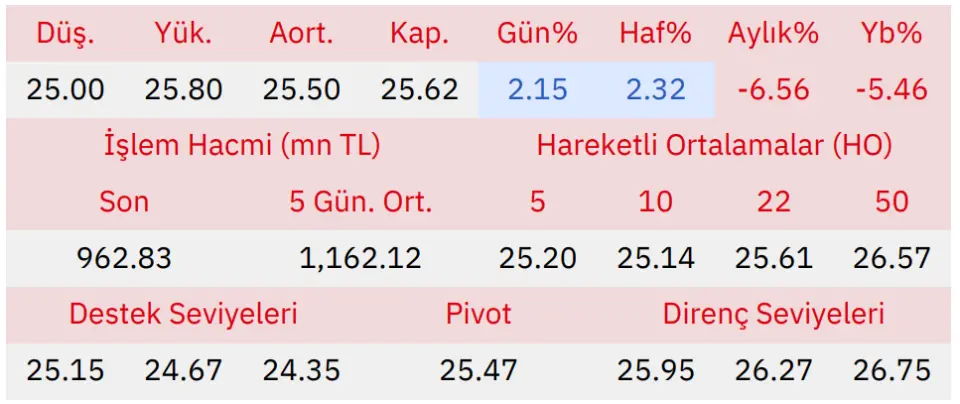 Gün içinde en düşük 25.00 en yüksek 25.80 seviyesini gören Kardemir Karabük Demir Çelik D hissesinin günü %2.15 kazançla tamamladığı gözlenmektedir. Pivot seviye 25.47 seviyesinden geçmekte olup, aşağı yönlü hareketlerde birinci destek 25.15, ikinci destek ise 24.67 seviyesinden geçmektedir. Dirençler ise sırasıyla 25.95, 26.27 seviyelerinden geçmektedir. Bu aşamada endeksin 5 günlük HO seviyesinin %1.65 üstünde, 22 günlük HO seviyesinin ise %0.04 üstünde hareket ettiği dikkat çekmektedir. Son gün işlem hacmi ise bu aşamada 5 günlük ortalama işlem hacminin % 17.15 altında gerçekleşmiştir.