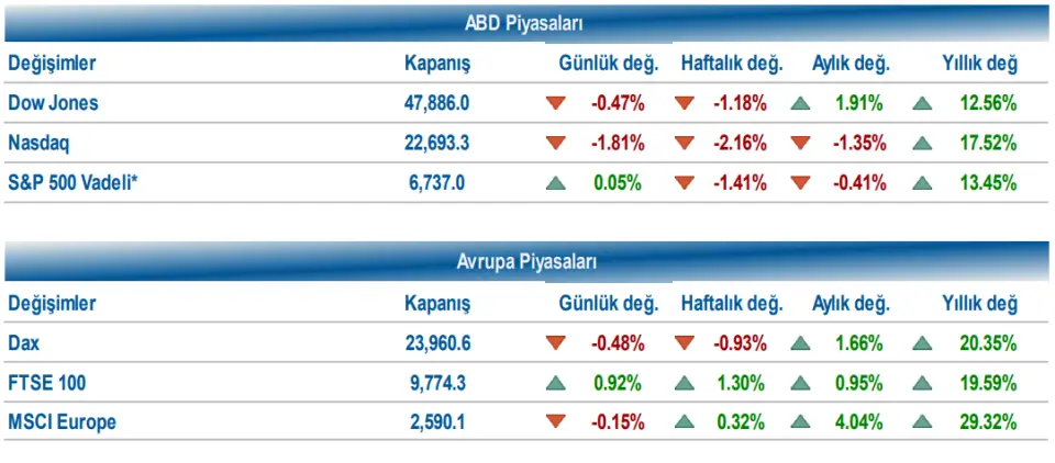 Dow Jones endeksi %0,47 puan düşüşle 47.885,97, S&P 500 endeksi %1,16 puan düşüşle 6.721,43, Nasdaq endeksi %1,81 puan azalışla 22.693,32 seviyesinden günü tamamladı. Euro Bölgesi’nde Kasım ayına ilişkin enflasyon verileri takip edildi. Kasım ayı TÜFE verisi, aylık bazda piyasa beklentileriyle uyumlu şekilde %0,3 gerileyerek, Ocak ayından bu yana ilk aylık düşüşünü kaydederken, yıllık enflasyon %2,1 artış ile piyasa beklentisi olan %2,2 yükselişin hafif altında gerçekleşti. Çekirdek enflasyon ise yıllık bazda beklentilere paralel olarak %2,4 yükseliş gösterdi.