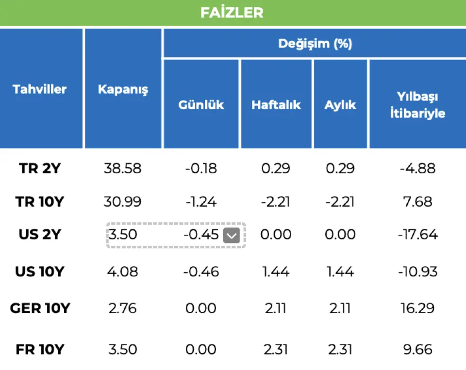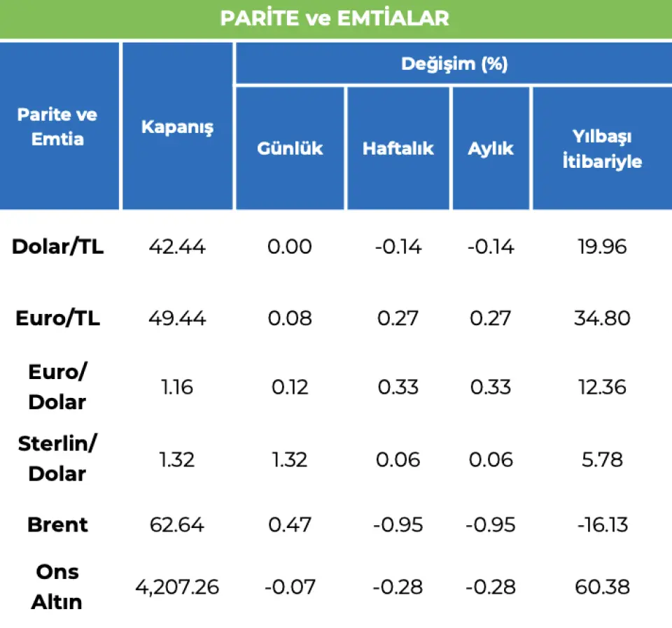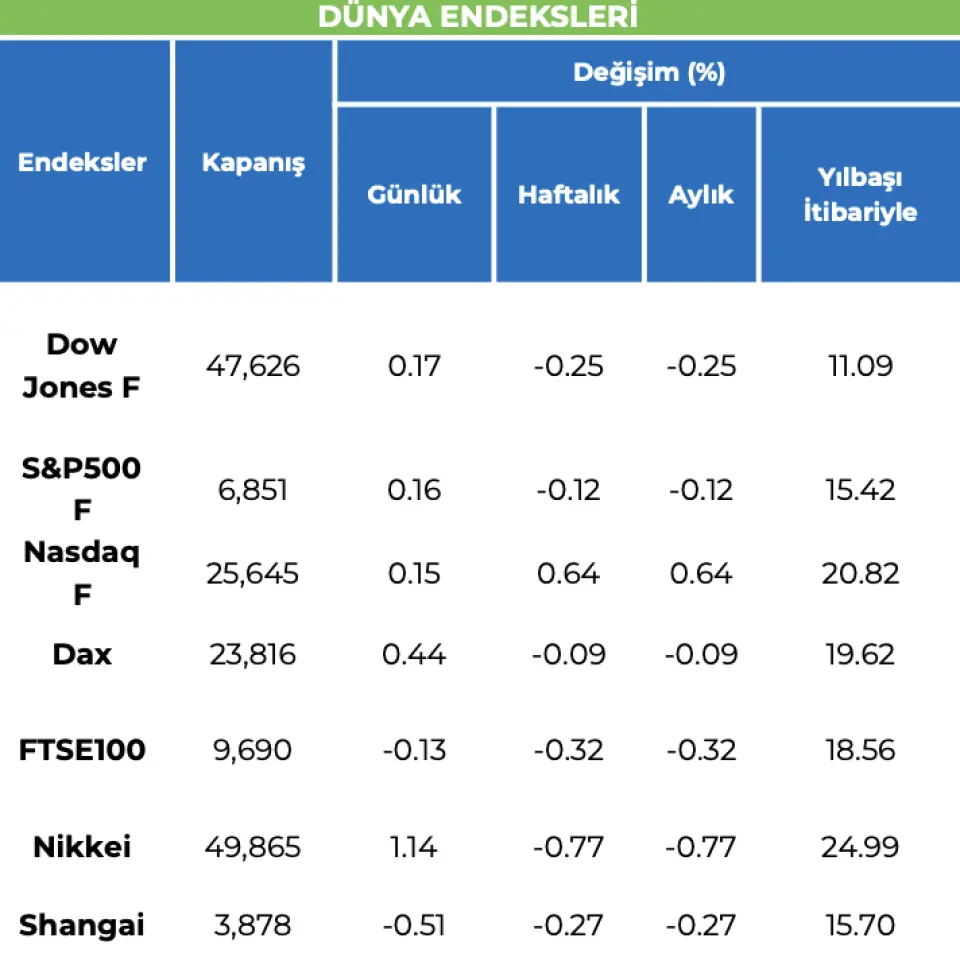 Emtia: Emtia piyasalarında karışık ama genel olarak temkinli bir görünüm öne çıkıyor. Değerli metallerde altın fiyatı gün içinde büyük bir hareket sergilemezken, gümüş önce arz kısıtları ve ABD'de daha düşük faiz beklentileriyle rekor seviyelere tırmandıktan sonra kâr realizasyonlarıyla geriledi. Enerji tarafında, West Texas Intermediate (WTI) tipi ham petrol yaklaşık %0,2 artışla 58,74 dolar seviyesinde yatay-aşağı dar bir bantta İşlem görüyor; piyasalar bir yandan ABD-Rusya arasında Ukrayna savaşıyla ilgili yürütülen üst düzey diplomatik temasların olası ateşkes ihtimalini, diğer yandan Rus enerji altyapısına yönelik devam eden saldırıların arz tarafına getirdiği riskleri fiyatlıyor.