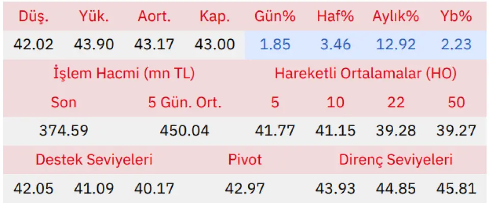 Gün içinde en düşük 42.02 en yüksek 43.90 seviyesini gören Mavi Giyim hissesinin günü %1.85 kazançla tamamladığı gözlenmektedir. Pivot seviye 42.97 seviyesinden geçmekte olup, aşağı yönlü hareketlerde birinci destek 42.05, ikinci destek ise 41.09 seviyesinden geçmektedir. Dirençler ise sırasıyla 43.93, 44.85 seviyelerinden geçmektedir. Bu aşamada endeksin 5 günlük HO seviyesinin %2.95 üstünde, 22 günlük HO seviyesinin ise %9.48 üstünde hareket ettiği dikkat çekmektedir. Son gün işlem hacmi ise bu aşamada 5 günlük ortalama işlem hacminin % 16.76 altında gerçekleşmiştir.