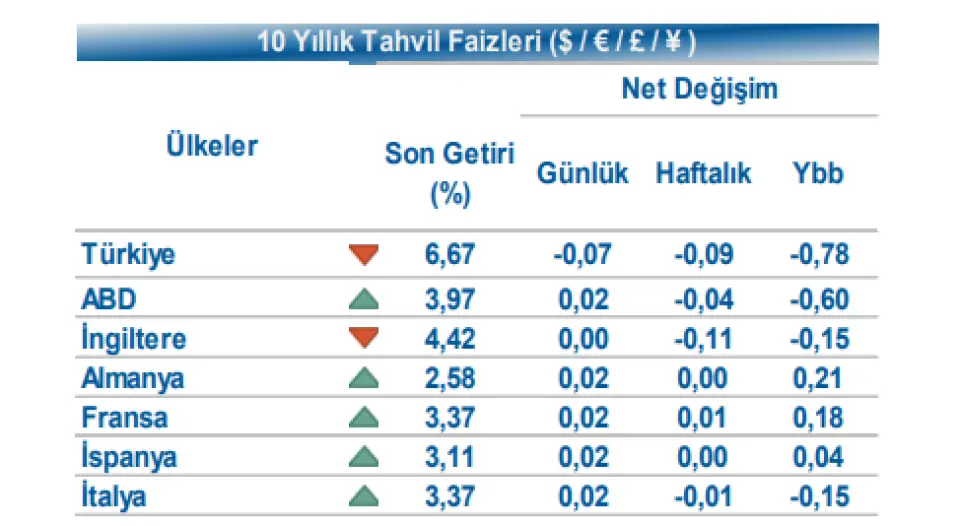 Halk Yatırım yayınladığı tarihli 24 Ekim günlük bültende tahvil ve döviz piyasalarındaki gelişmelere yer verdi. Aracı kurumun analizi şu şekilde:Küresel piyasalarda, veri akışının zayıf olduğu günde İngiltere’de CBI iş dünyası güveni endeksi Ekim ayında -31 olarak açıklanırken, önümüzdeki yıla ilişkin ihracat iyimserliği de geriledi. İngiltere’de zayıf gelen verilerde yüksek faiz ortamı ve bütçeye ilişkin belirsizlikler etkili oldu. Gün içinde ABD 10 yıllık gösterge tahvil faizi 3 bp artışla %3,98, Almanya 10 yıllık gösterge tahvil faizi 1 bp artışla %2,57 seviyesine yükseldi.