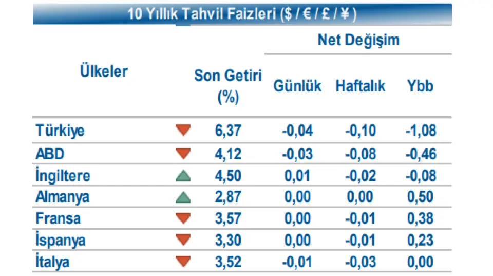 ABD’de ise Kasım ayında TÜFE yıllık bazda %2,7, Çekirdek TÜFE ise %2,6 seviyesine gerileyerek beklentilerin altında gerçekleşti. Ayrıca Haftalık İşsizlik Maaşı Başvuruları 224 bin kişi artışla beklentilerin hafif altında açıklandı. Veriler sonrası, tahvil piyasaları alıcılı seyir izledi. Gün içinde, ABD 10 yıllık gösterge tahvil faizi 3 bp azalışla %4,12, Almanya 10 yıllık gösterge tahvil faizi %2,87 seviyesinde işlem gördü. Türkiye’nin 5 yıllık Dolar cinsi CDS risk primi 1 bp azalışla 209 bp seviyesinden gerilerken, Ocak 2035 vadeli 10 yıllık Eurobond faizi 4 bp azalışla %6,37 seviyesinden işlem gördü. Döviz tarafında, majör para birimleri ABD Dolar’ı karşısında değer kazandı. Dolar Endeksi 98,174 seviyesine gerilerken, Euro / Dolar paritesi 1,1748 seviyesinde yükseldi.