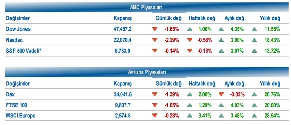 Dow Jones endeksi %1,65 düşüşle 47.457,22, S&P 500 endeksi %1,66 düşüşle 6.737,49, Nasdaq endeksi %2,29 düşüşle 22.870,36 puandan günü tamamladı. Tahvil faizleri cephesinde 2 yıllık tahvil faizi %3,59, 10 yıllık tahvil faizi ise %4,12 seviyesine yükseldi. VIX endeksi de 17,51’den 20,00 seviyesine yükseliş gösterdi. Avrupa piyasalarında da zayıf seyir izlendi. DAX %1,39, Euro Stoxx %0,83, CAC 40 %0,11, FTSE 100 endeksi %1,05 oranında değer kaybetti. Euro Bölgesi’nde sanayi üretimi açıklandı. Eylül’de üretim aylık %0,2, yıllık %1,2 ile beklentilerin altında artış kaydetti.