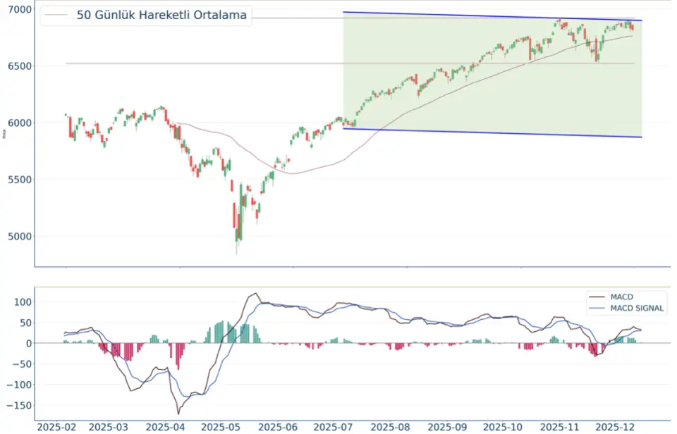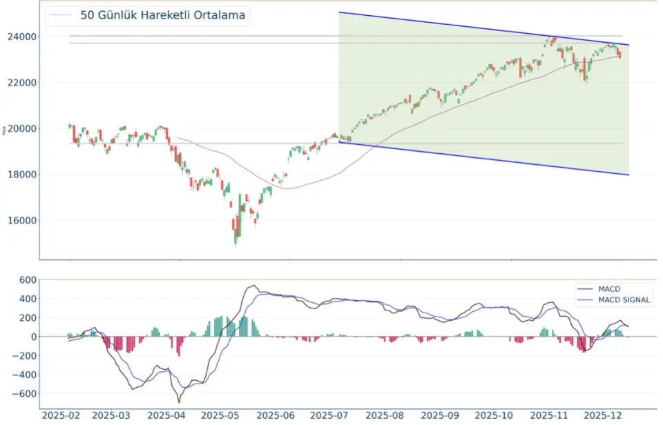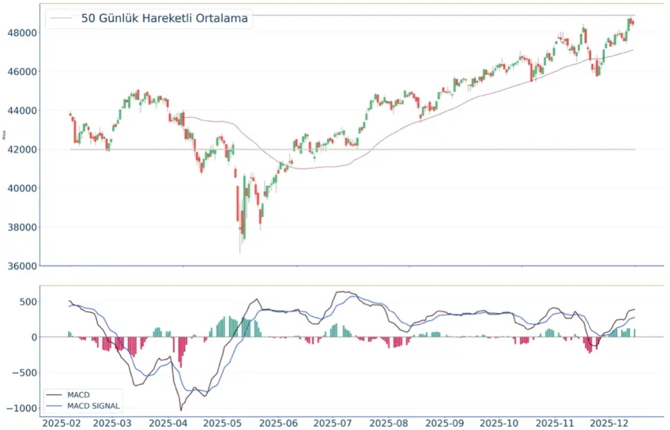 Dow Jones Endeksi kapanışla birlikte %0.09 düşüş gerçekleştirdi. Güne 48.594 seviyesinde başladı ve gün içinde en yüksek 48.679, en düşük 48.283 seviyesinden işlem gördü. Kapanışı ise 48.416 seviyesinde tamamladı. Son kapanış 5 günlük hareketli ortalamanın üzerinde gerçekleşti. MACD çizgileri al konumunda, sıfır çizgisinin üzerinde hareket ediyor. Yukarı yönlü hareketlerde izlenebilecek birinci direnç 49.508 olurken destek olarak 48.066 izlenebilir.
