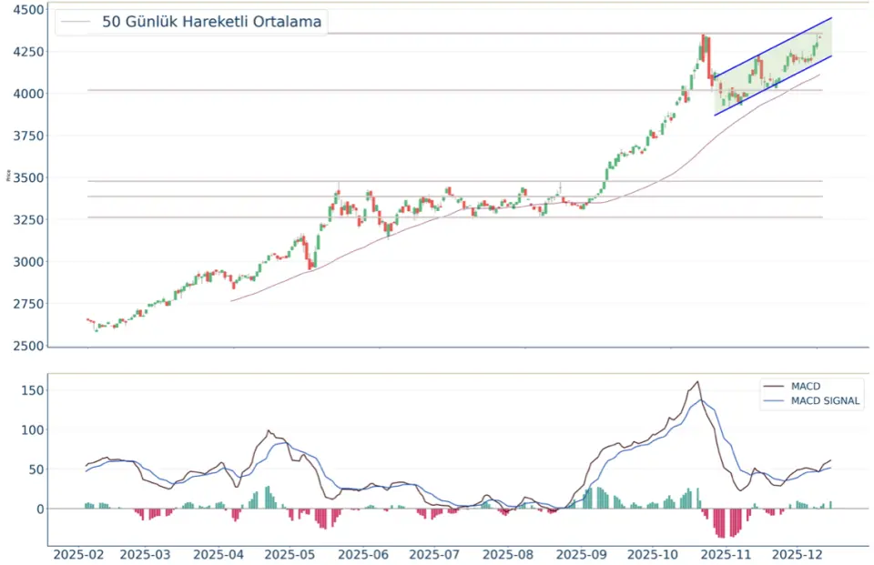 Ons Altın, geçtiğimiz günü %0.73 yükseliş ile kapattıktan sonra, 20 günlük hareketli ortalaması olan 4.175 seviyesinin üzerinde fiyatlanıyor. Bu durum Ons Altın için aylık periyotta pozitif bir görüntü çiziyor. Son günde yapılan işlemlerde ise en yüksek 4.345 seviyesinde işlem gördükten sonra günü 4.331 seviyesinde tamamladı. Öte yandan, trend göstergelerinden biri olan MACD çizgileri al konumunda, sıfır çizgisinin üzerinde hareket ediyor. 4.425-4.446 dirençler, 4.302-4.236 destekler olarak değerlendirilebilir.
