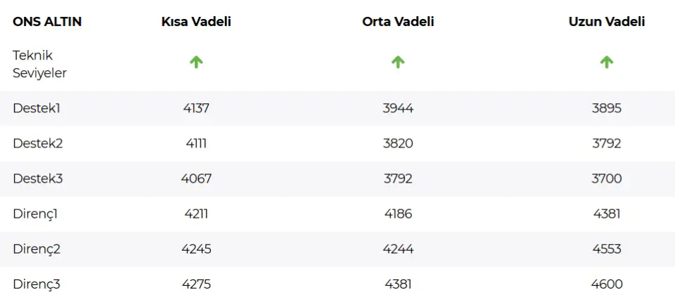 Güçlenen faiz indirimi ihtimali ons altında alım iştahını beslemeyi sürdürüyor. Bu tablo, fiyatın son günlerde koruduğu yukarı yönlü eğilimi desteklerken pozitif bölgede fiyatlanmayı da beraberinde getiriyor. 4157 seviyesi üzerindeki olası bir kapanış ise haftanın üçüncü alıcılı günü olarak kayda geçebilir.