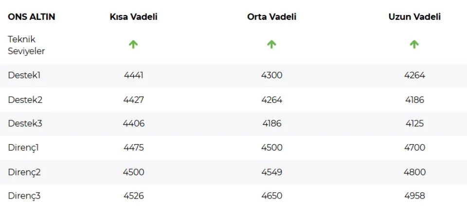 Ons altın fiyatlarında kısa vadeli hareket Envelopes(35) ve 4406 seviyesinin üzerinde pozitif seyrini koruyor. Yukarı yönlü hareketin devamında ilk olarak 4500, sonrasında ise rekor seviye 4550 seviyesinden gelecek tepkiler takip ediliyor olacak. Seans içerisinde 4406 seviyesine geri çekilme beklenebilir. Alternatif senaryoda fiyatlar tekrar Envelopes(35) ve 4406 seviyesinin altına gelirse ilk olarak 4350, sonrasında ise yatay hareketin alt sınırı olan 4300 seviyesi gündeme gelebilir.