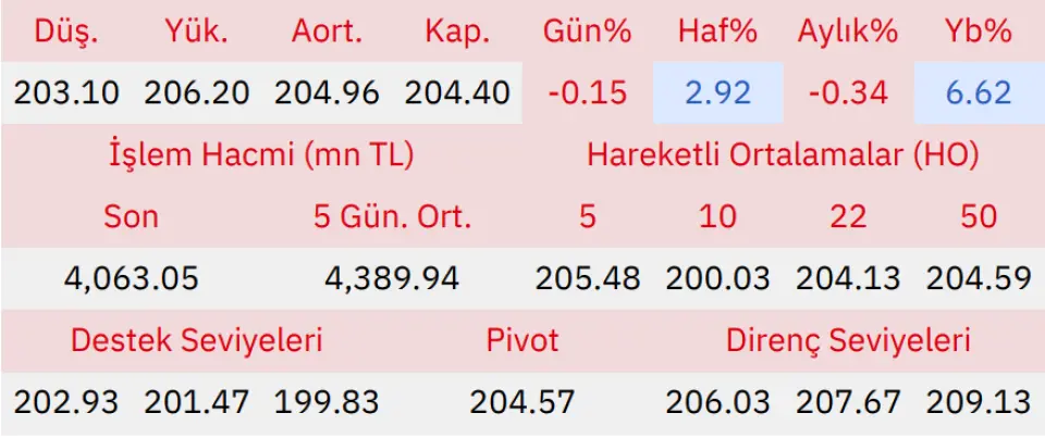 Gün içinde en düşük 203.10 en yüksek 206.20 seviyesini gören Pegasus Hava Taşımacılığı hissesinin günü %0.15 kayıpla tamamladığı gözlenmektedir. Pivot seviye 204.57 seviyesinden geçmekte olup, aşağı yönlü hareketlerde birinci destek 202.93, ikinci destek ise 201.47 seviyesinden geçmektedir. Dirençler ise sırasıyla 206.03, 207.67 seviyelerinden geçmektedir. Bu aşamada endeksin 5 günlük HO seviyesinin %0.53 altında, 22 günlük HO seviyesinin ise %0.13 üstünde hareket ettiği dikkat çekmektedir. Son gün işlem hacmi ise bu aşamada 5 günlük ortalama işlem hacminin % 7.45 altında gerçekleşmiştir.