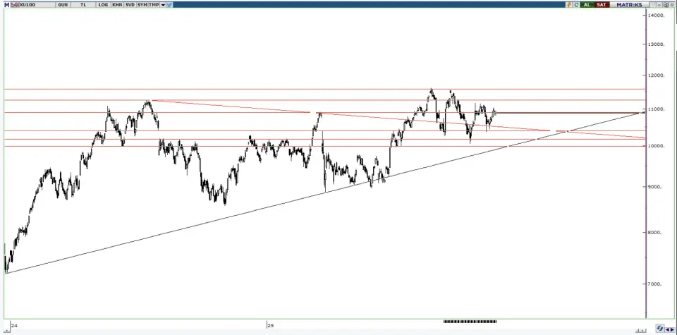 Hareketin devamı durumunda ise 11.580 seviyesi hedeflenebilir. Aşağı yönlü hareketlerde ilk etapta alçalan trendin desteği olan 10.505 seviyesi takip edilebilir. Desteğin kırılması durumunda yatay destek olan 10.400 seviyesi izlenebilir. Hareketin devamı durumunda ise 10.165 seviyesi hedeflenebilir.