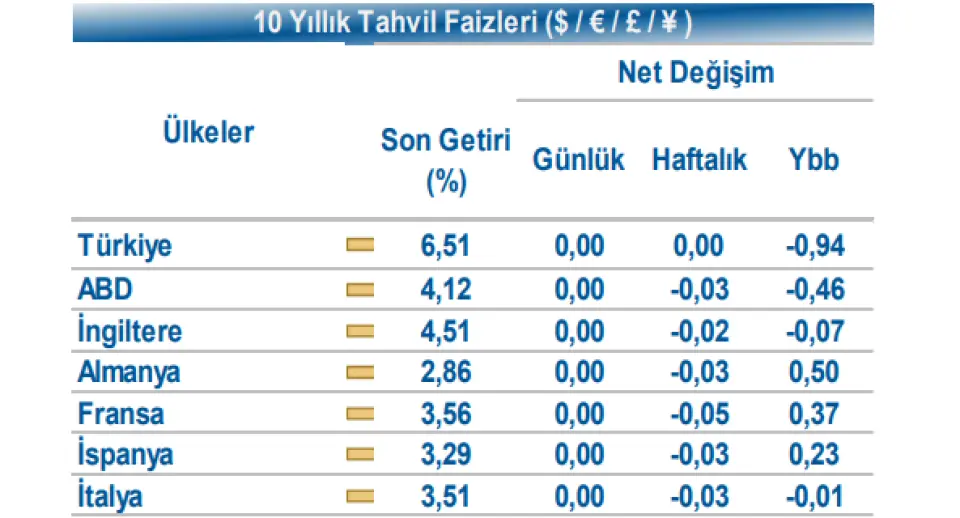 Halk Yatırım yayınladığı tarihli 29 Aralık günlük bültende tahvil ve döviz piyasalarındaki gelişmelere yer verdi. Aracı kurumun analizi şu şekilde:Küresel piyasalarda, Noel tatili sonrası veri akışının gerçekleşmediği günde, ABD 10 yıllık gösterge tahvil faizi %4,12 seviyesinde izlendi. Türkiye’nin 5 yıllık Dolar cinsi CDS risk primi 205 bp seviyesinden işlem görürken, Eylül 2035 vadeli 10 yıllık Eurobond %6,51 seviyesinden fiyatlandı.