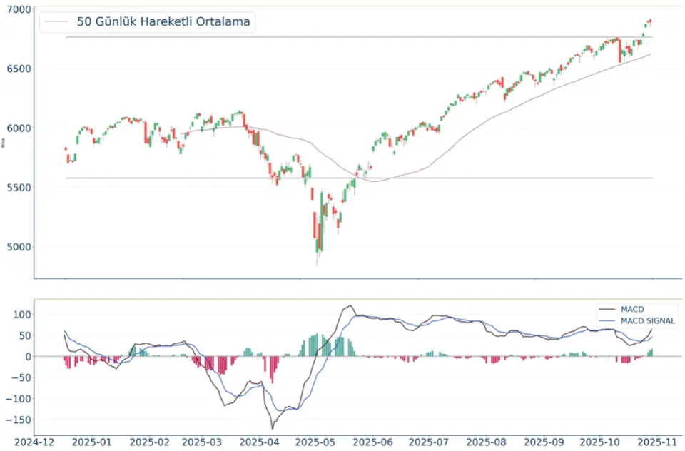 S&P 500 Endeksi perşembe günü gerçekleşen işlemlerde en yüksek 6.920, en düşük ise 6.851 seviyesinde işlem gördükten sonra %0.0 azalarak azalarak 6.890 seviyesinde günü tamamladı. 20 günlük hareketli ortalamanın üzerinde hareket etmesi ise S&P 500 Endeksi adına olumlu olarak nitelendirilebilir. Cuma gün içi işlemlerde 6.831 ve 6.717 desteklerini ve 7.040 ve 7.088 dirençlerini takip edildi.