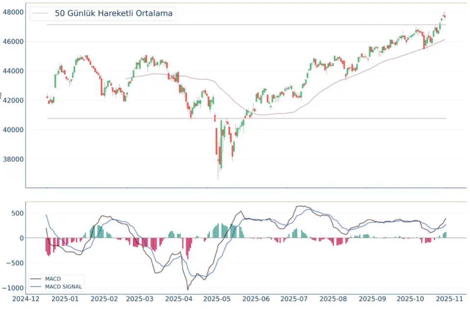 Dow Jones Endeksi geçtiğimiz gün %0.16 azalarak 47.632 seviyelerinden işlem görüyorken 50 günlük hareketli ortalaması olan 46.122 seviyesinin de %3 üzerinde seyrediyor. Bu seviyeye göre Dow Jones Endeksi için orta vadeli negatif görünüm hakimdir. Destek ve direnç seviyeleri; Cuma gün içinde pozitif performans gerçekleşmesi halinde 48.768-49.110 direnç, negatif performans gerçekleşmesi halinde ise 47.280-46.419 destek seviyeleri olarak izlenmesi bekleniyordu.