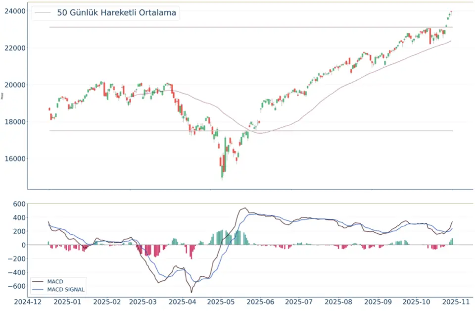 Nasdaq Endeksi geçtiğimiz günü 23.958 seviyesinde %0.55 yükselişle tamamladı. Önemli momentum indikatörlerinden biri olan RSI değerine bakıldığında ise aşırı alım bölgesinde olduğu görülebilir. Öte yandan, ilk direnç olarak 24.453 seviyesi karşımıza çıkarken bu seviyenin üzerinde 24.638 direncine yönelim gerçekleşebilir. Aşağı yönlü işlemlerde ise 23.720 ve 23.330 destekleri takip edilmelidir.