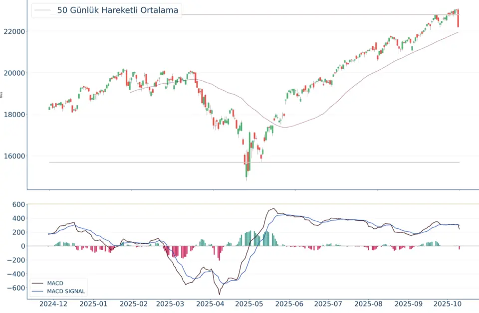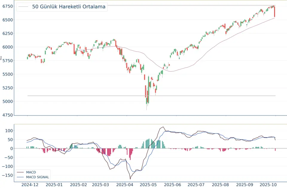 S&P 500 Endeksi geçtiğimiz günü 6.552 seviyesinde %2.71 düşüşle tamamladı. Önemli momentum indikatörlerinden biri olan RSI değerine bakıldığında ise aşırı alım veya satım bölgesinde olmadığı görülebilir. Öte yandan, ilk direnç olarak 6.781 seviyesi karşımıza çıkarken bu seviyenin üzerinde 6.851 direncine yönelim gerçekleşebilir. Aşağı yönlü işlemlerde ise 6.531 ve 6.348 destekleri takip edilmelidir.