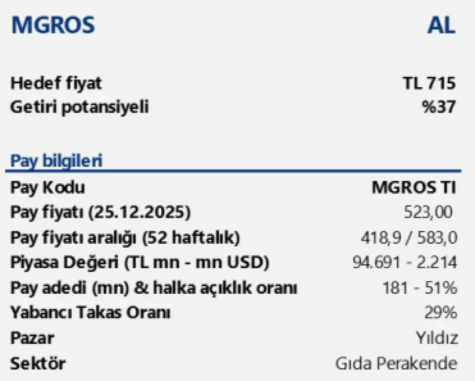Migros için 12 aylık hedef fiyatımızı 715,00 TL seviyesinde koruyor ve “AL” tavsiyemizi sürdürüyoruz. Migros’u, hisse performansının dönem dönem operasyonel ivmenin gerisinde kaldığı bir zeminde, pazar payı kazanan, verimlilik odaklı yatırımlarla ölçeğini büyüten ve aynı zamanda defansif karakterini koruyabilen nadir tüketim hikayelerinden biri olarak görüyoruz. Bu çerçevede Migros, Model Portföyümüzdeki yerini korumaya devam etmektedir.