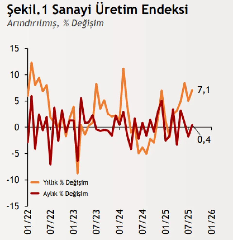 "TÜİK verilerine göre sanayi üretimi Ağustos ayında aylık %0,4’lük artışla pozitif seviyede gerçekleşti. Yıllık bazda artış oranı ise %7,1 olarak kaydedildi. Sanayinin alt sektörleri incelendiğinde, madencilik ve taş ocakçılığı sektörü endeksi bir önceki yılın aynı ayına göre %2,6 artarken imalat sanayi sektörü endeksi %7,7 arttı ve elektrik, gaz, buhar ve iklimlendirme üretimi ve dağıtımı sektörü endeksi ise %6,1 artış kaydetti. Böylelikle Temmuz’da deprem sonrası en sert daralmayı yaşan sanayi üretimi endeksi Ağustos’ta yeniden yükselişe geçti.