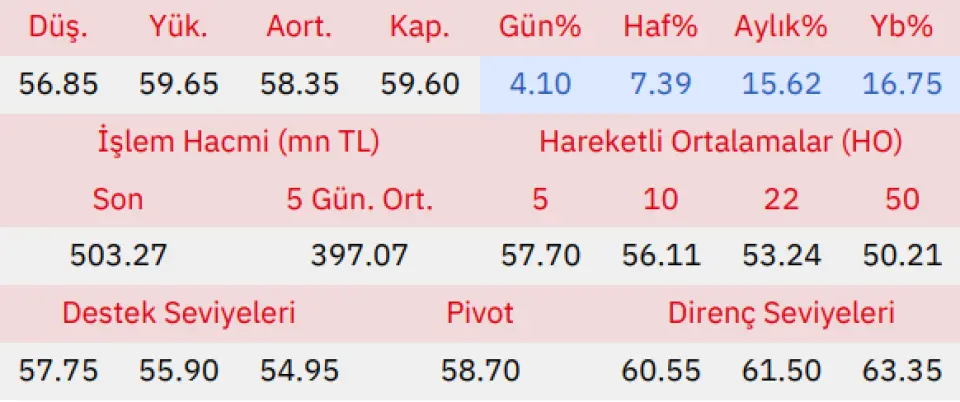 Gün içinde en düşük 56.85 en yüksek 59.65 seviyesini gören Şok Marketler Ticaret hissesinin günü %4.10 kazançla tamamladığı gözlenmektedir. Pivot seviye 58.70 seviyesinden geçmekte olup, aşağı yönlü hareketlerde birinci destek 57.75, ikinci destek ise 55.90 seviyesinden geçmektedir. Dirençler ise sırasıyla 60.55, 61.50 seviyelerinden geçmektedir. Bu aşamada endeksin 5 günlük HO seviyesinin %3.29 üstünde, 22 günlük HO seviyesinin ise %11.95 üstünde hareket ettiği dikkat çekmektedir. Son gün işlem hacmi ise bu aşamada 5 günlük ortalama işlem hacminin % 26.75 üstünde gerçekleşmiştir.