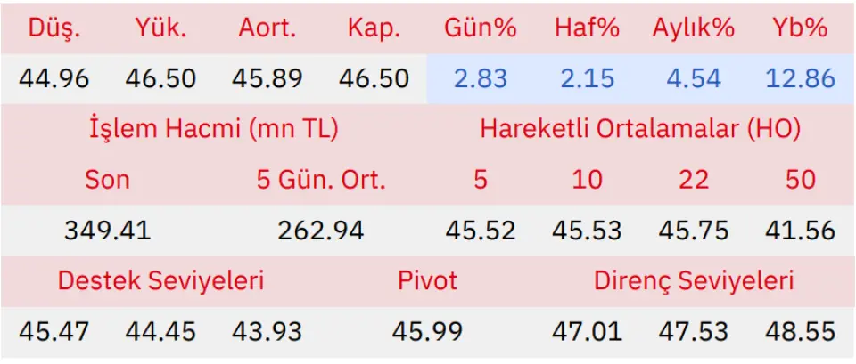 Gün içinde en düşük 44.96 en yüksek 46.50 seviyesini gören Şok Marketler Ticaret hissesinin günü %2.83 kazançla tamamladığı gözlenmektedir. Pivot seviye 45.99 seviyesinden geçmekte olup, aşağı yönlü hareketlerde birinci destek 45.47, ikinci destek ise 44.45 seviyesinden geçmektedir. Dirençler ise sırasıyla 47.01, 47.53 seviyelerinden geçmektedir. Bu aşamada endeksin 5 günlük HO seviyesinin %2.14 üstünde, 22 günlük HO seviyesinin ise %1.63 üstünde hareket ettiği dikkat çekmektedir. Son gün işlem hacmi ise bu aşamada 5 günlük ortalama işlem hacminin % 32.89 üstünde gerçekleşmiştir.