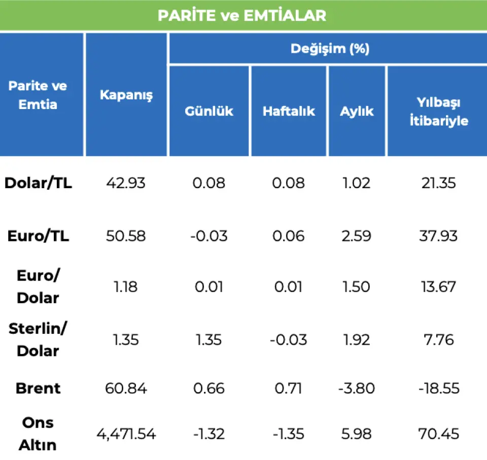Emtia Piyasaları: Emtia piyasaları yılın ilk işlem gününe genel olarak yukarı yönlü bir başlangıç yaptı ve hem büyüme beklentilerini hem de güvenli liman talebini aynı anda yansıttı. Spot altın yüzde 1,3 yükselerek 4.373,88 dolar/ons seviyesine çıkarken, 2025'te 1979'dan bu yana en güçlü yıllık performanslarından birini sergilemesinin ardından 2026'ya da pozitif başlamış oldu; bu da jeopolitik riskler ve para politikası belirsizliğine karşı güvenli liman talebinin devam ettiğini gösteriyor.