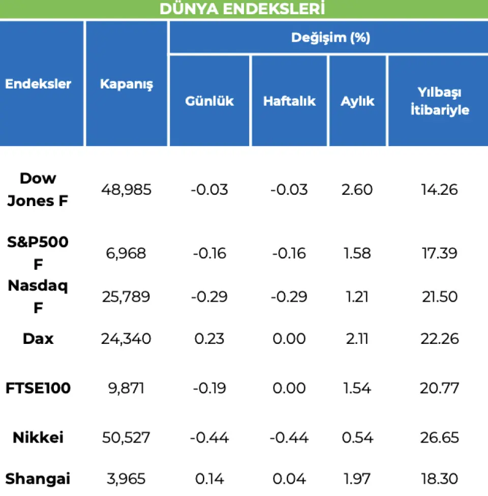 ABD Piyasaları: ABD piyasalarında yılın ilk işlem gününe risk iştahı hakim. S&P 500 vadeli işlemleri yaklaşık %0,4, teknoloji ağırlıklı Nasdaq 100 vadeli işlemleri ise %0,7 yükselerek hafif pozitif bir açılışa işaret ediyor; bu da 2025'teki güçlü performansın ardından yapay zekâ ve yarı iletken temalarının hâlâ ana hikâye olduğunu gösteriyor. Nasdaq 100 endeksi geçtiğimiz yıl %20 yükselirken, Nvidia gibi Al öncüsü hisselerde ciddi primler görüldü; ancak büyük Wall Street kurumları, özellikle teknoloji ve Al tarafında şişkin değerlemelere ve önümüzdeki 12-24 ayda %10'dan fazla olası bir düzeltmeye dikkat çekiyor.