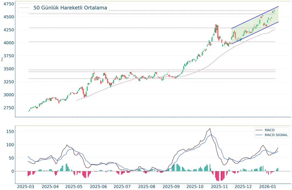Gün içi görülen en yüksek seviye 4.637 iken kapanış 4.607 seviyesinde %0.4 yükseliş ile gerçekleşti. Ortalama işlem hacimlerine bakıldığında ise 5 iş günü için gözlenirken 5 günlük hareketli ortalamanın üzerinde hareket etmesi kısa vadedeki olumlu görünüme işaret ediyor. Ayrıca, gün itibarıyla 4.571 seviyesi yeni destek görevi görürken kısa vadeli direnç 4.712 seviyesi oldu. Endeksin aşağı yönlü hareketini devam ettirmesi halinde 4.492 seviyesi ikinci destek görevi görürken yukarı yönlü hareketlerde ise 4.744 seviyesini ikinci direnç olarak izleyeceğiz.