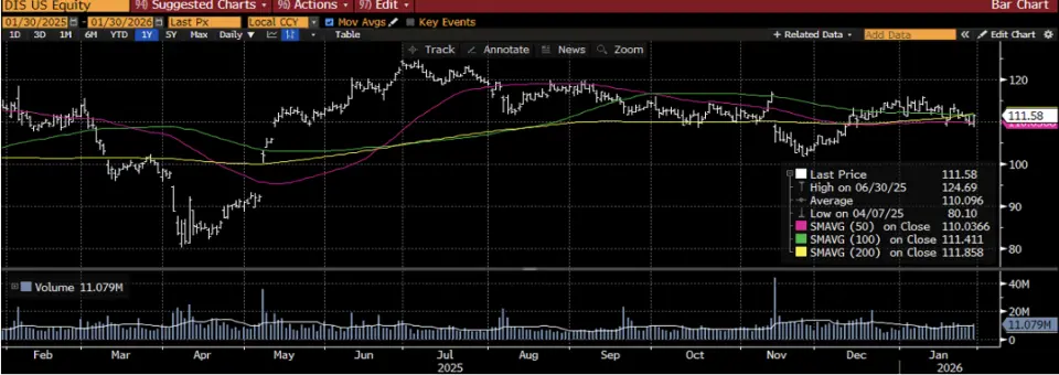 DIS, küresel ölçekte medya, eğlence ve içerik üretimi alanlarında faaliyet gösteren entegre bir medya grubudur. Şirket; film stüdyoları, televizyon ağları, dijital yayın platformları ve tema parkları aracılığıyla geniş bir içerik ve eğlence ekosistemi yönetmektedir. Hisse için Bloomberg’de yer alan analist beklentileri 12 aylık vadede ortalama 132,69 USD hedef fiyata ve son kapanış fiyatına göre %18,9 getiri potansiyeline işaret ediyor. S&P 500 endekisinin üzerinde bir getiri potansiyeline sahip olsa da, önümüzdeki dönemde hedef fiyatın yapılacak revizyonlarla endeks getirisinin üzerinde kalacağını öngörüyoruz. Hisse için 31 analist AL, 8 analist TUT tavsiyesi veriyor. Teknik açıdan yakın vadede 122,5 USD direnç, 106 USD ise destek seviyesi olarak takip edilebilir.