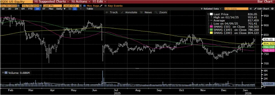 EQIX, küresel ölçekte veri merkezi işletmeciliği yapan ve şirketlere dijital altyapı çözümleri sunan bir gayrimenkul yatırım ortaklığıdır. Şirket, müşterilerinin bulut hizmetleri, ağ sağlayıcıları ve iş ortaklarıyla güvenli ve düşük gecikmeli şekilde bağlantı kurmasını sağlayan platformlar işletmektedir. Hisse için Bloomberg’de yer alan analist beklentileri 12 aylık vadede ortalama 957,04 USD hedef fiyata ve son kapanış fiyatına göre %15,9 getiri potansiyeline işaret ediyor.