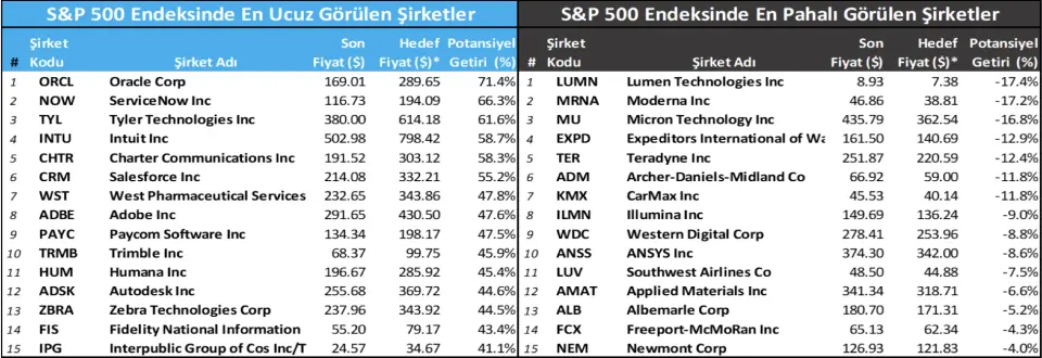 Bloomberg’de paylaşılan analist beklentilerine göre, potansiyel getiri oranlarına göre en ucuz görülen 15 şirketi ve yine potansiyellerine göre en pahalı görülen 15 şirketi aşağıdaki tablolarda paylaşıyoruz. Buradaki şirketler, belli bir piyasa değeri üzerindeki şirketler arasından filtrelenmiştir. Veriler, Tacirler Yatırım beklentilerini değil, Bloomberg’de paylaşılan ortalama analist hedef fiyatlarını ve potansiyellerini yansıtmaktadır.