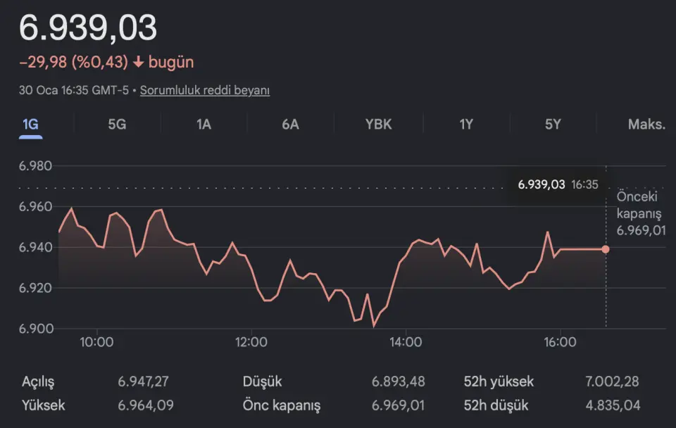 S&P 500 Endeksi kapanışla birlikte %0.43 düşüş gerçekleştirdi. Güne 6.947 seviyesinde başladı ve gün içinde en yüksek 6.964, en düşük 6.893 seviyesinden işlem gördü. Kapanışı ise 6.939 seviyesinde tamamladı. Kısa vadede negatif görünüm mevcuttur.
