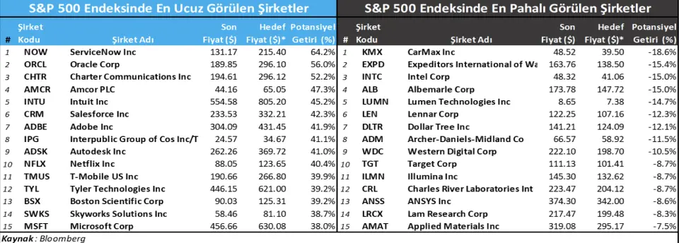 Bloomberg'de paylaşılan analist beklentilerine göre, potansiyel getiri oranlarına göre en ucuz görülen 15 şirketi ve yine potansiyellerine göre en pahalı görülen 15 şirketi aşağıdaki tablolarda paylaşıyoruz. Buradaki şirketler, belli bir piyasa değen üzerindeki şirketler arasından filtrelenmiştir. Veriler, Tacirler Yatırım beklentilerini değil, Bloomberg de paylaşılan ortalama analist hedef fiyatlarını ve potansiyellerini yansıtmaktadır.