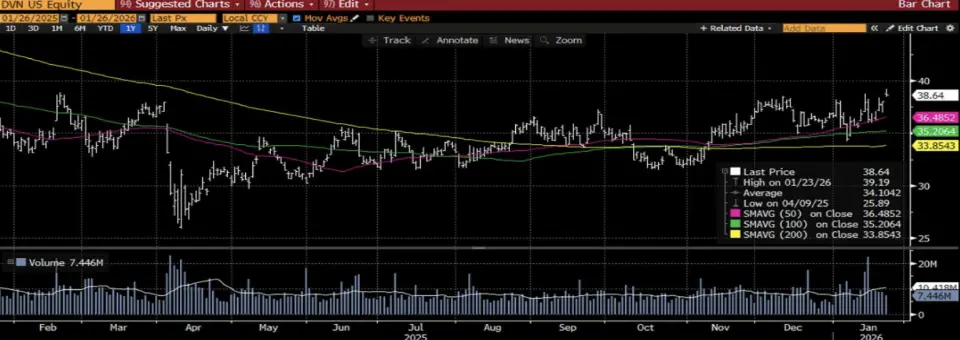 DVN, Amerika Birleşik Devletleri’nde faaliyet gösteren bağımsız bir petrol ve doğal gaz arama ve üretim şirketidir. Şirket, başta Permian Havzası olmak üzere Eagle Ford, Bakken ve Anadarko gibi önemli enerji bölgelerinde varlık göstermektedir. Hisse için Bloomberg’de yer alan analist beklentileri 12 aylık vadede ortalama 45,03 USD hedef fiyata ve son kapanış fiyatına göre %16,5 getiri potansiyeline işaret ediyor. S&P 500 endekisinin altında bir getiri potansiyeline sahip olsa da, önümüzdeki dönemde hedef fiyatın yapılacak revizyonlarla endeks getirisinin üzerinde kalacağını öngörüyoruz. Hisse için 25 analist AL, 10 analist TUT tavsiyesi veriyor. Teknik açıdan yakın vadede 41,6 USD direnç, 36 USD ise destek seviyesi olarak takip edilebilir.