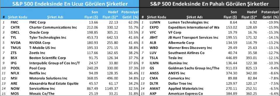 Bloomberg’de paylaşılan analist beklentilerine göre, potansiyel getiri oranlarına göre en ucuz görülen 15 şirketi ve yine potansiyellerine göre en pahalı görülen 15 şirketi aşağıdaki tablolarda paylaşıyoruz. Buradaki şirketler, belli bir piyasa değeri üzerindeki şirketler arasından filtrelenmiştir. Veriler, Tacirler Yatırım beklentilerini değil, Bloomberg’de paylaşılan ortalama analist hedef fiyatlarını ve potansiyellerini yansıtmaktadır.