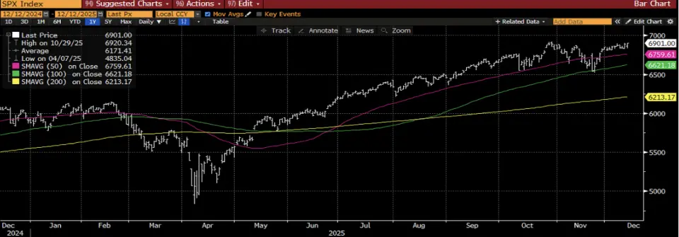 S&P 500 endeksi, son işlem gününü %0,21 artarak 6901 puanda tamamladı. Fed’in olası faiz indirimleri ve tahvil alımları adımlarına yönelik yönlendirmeleri risk iştahını arttırırken, ABD, Avrupa ve Çin için büyüme beklentilerinin yukarı yönlü güncellenmesi de 2026’ya yaklaşırken küresel iyimserliği destekleyen bir başka katalizör konumuna geliyor.