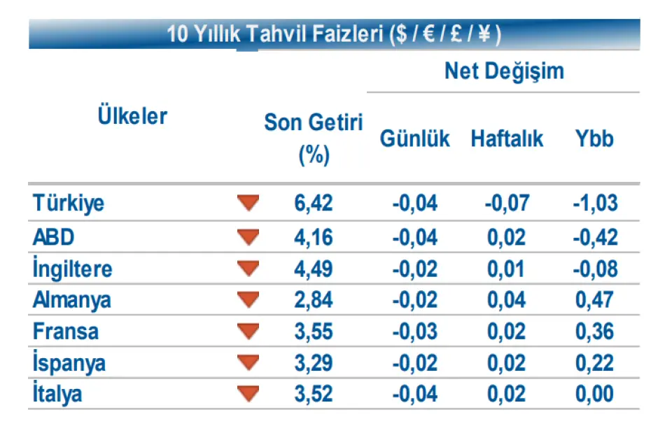 Gün içinde, ABD 10 yıllık gösterge tahvil faizi 4 bp azalışla %4,16, Almanya 10 yıllık gösterge tahvil faizi 2 bp azalışla %2,84 seviyesinden işlem gördü. Türkiye’nin 5 yıllık Dolar cinsi CDS risk primi 2 bp azalışla 216 bp seviyesine gerilerken, Ocak 2035 vadeli 10 yıllık Eurobond faizi 4 bp azalışla %6,42 seviyesinden işlem gördü.