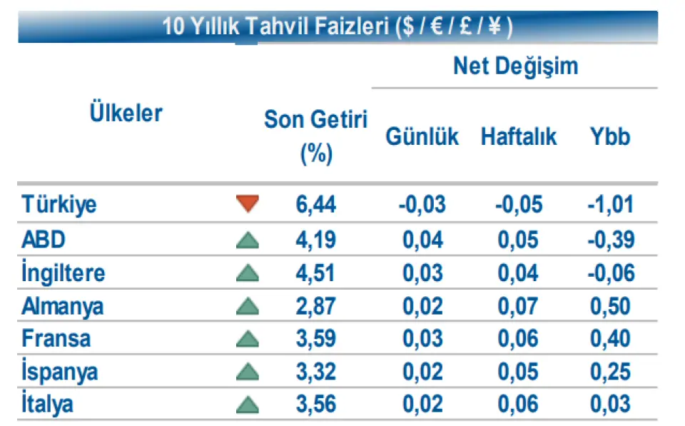 Türkiye’nin 5 yıllık Dolar cinsi CDS risk primi 2 bp azalışla 218 bp seviyesine gerilerken, Ocak 2035 vadeli 10 yıllık Eurobond faizi 3 bp azalışla %6,44 seviyesinden işlem gördü. Döviz tarafında, majör para birimleri ABD Dolar’ı karşısında değer kazandı. Dolar Endeksi 98,466 seviyesine yükselirken, Euro / Dolar paritesi 1,1729 seviyesinde yükseldi. Dolar / TL spot kuru ise 42,69 seviyesinden işlem gördü.
