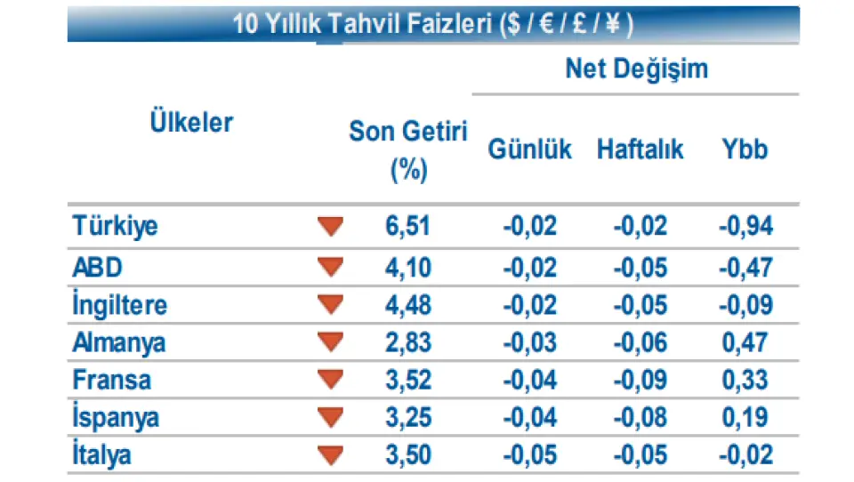 Küresel tarafta, veri gündeminin zayıf olduğu günde tahvil piyasalarında alıcılı bir seyir izlendi. Gün içinde, ABD 10 yıllık gösterge tahvil faizi 2 bp azalışla %4,10, Almanya 10 yıllık gösterge tahvil faizi 3 bp azalışla %2,83 seviyesinde işlem gördü.