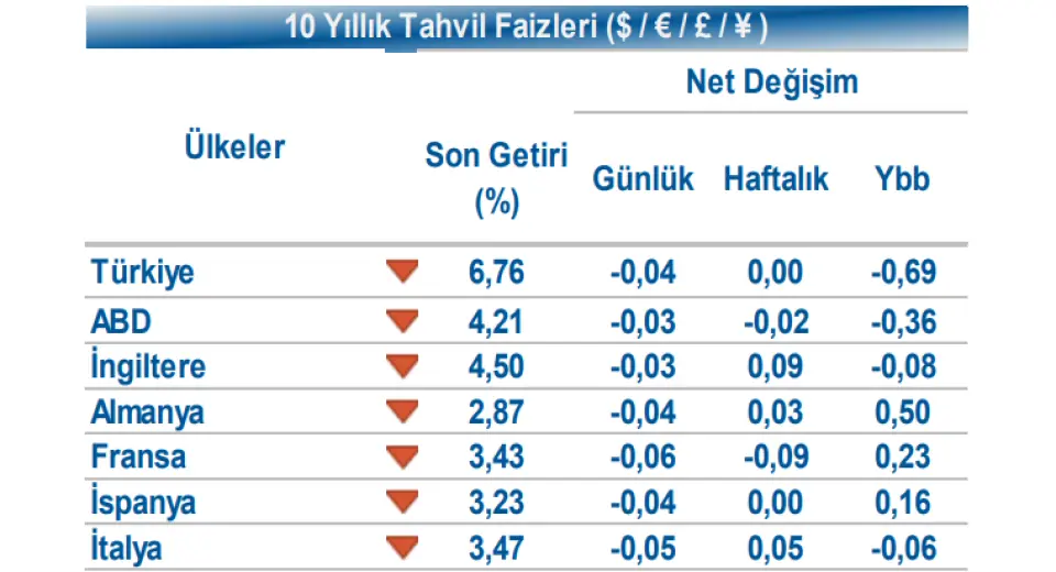 Yurt içinde, TL tahvillerde sınırlı alıcılı bir seyir izlendi. 2 yıllık gösterge tahvilin bileşik faizi 14 bp azalışla %34,54 seviyesine, 10 yıllık gösterge tahvilin bileşik faizi 1 bp artışla %29,24 seviyesine yükseldi.