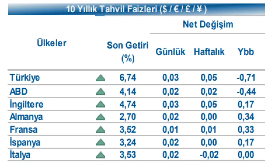 Küresel piyasalarda, olumlu jeopolitik gelişmelerin etkisiyle tahvil piyasaları satıcılı seyir izledi. Gün içinde ABD 10 yıllık gösterge tahvil faizi 2 bp artışla 4,14, Almanya 10 yıllık gösterge tahvil faizi 2 bp artışla %2,70 seviyesinde işlem gördü. Türkiye’nin 5 yıllık Dolar cinsi CDS risk primi 258 bp’dan işlem görürken, Ocak 2035 vadeli 10 yıllık Eurobond faizi 3 bp artışla %6,74 seviyesinden işlem gördü. Döviz tarafında, majör para birimleri ABD Dolar’ı karşısında değer kaybetti.