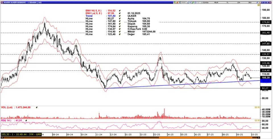 ULKER: 123,46 seviyesinden başlayan geri çekilmenin ardından yükselen trend desteğinden aldığı destekle bir miktar toparlanma sergilemektedir. Mevcut görünümde trend çizgisi üzerinde fiyatlamaların devam etmesi 114,40 ve 123,46 dirençlerine yönelik hareket akışını destekleyebilir. Olası baskılanma durumunda trend çizgisi güçlü destek konumunda bulunurken altına inilmesi halinde 97,27 seviyesine doğru baskının derinleşmesini sağlayabilir.