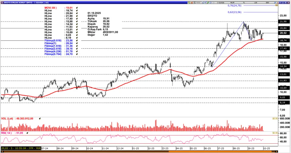 EKGYO: 18,74 – 20,84 bölgesinde bant hareketi sergileyen EKGYO, 69 periyotluk ortalamadan aldığı destekle iyimser görünümünü sürdürmektedir. Ortalama üzerinde fiyat hareketlerinin devam etmesi ilk etapta 20,84 seviyesine doğru hareket alanı oluşturabilir. 20,84 seviyesi üzerinde kalıcı fiyat hareketleri izlenmesi 21,98 ve 23,56 seviyesine doğru yükselişi destekleyerek yeni TL bazlı zirve seviyelerine doğru hareket akışı sağlayabilir. Olası baskılanmalarda ise 69 günlük ortalama bölgesi güçlü destek olurken altında fiyatlamalar baskıyı 17,40 seviyesine doğru derinleştirebilir.