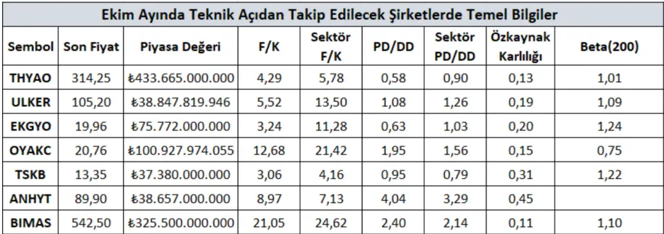 Ekim ayı dinamiklerinde teknik göstergelerle uyumlu çalışabileceğini düşündüğümüz şirketlere yönelik genel düşüncelerimizi raporumuzda ayrıntılı bir şekilde sizlere teknik analiz bölümünde paylaştık. Bu şirketlere yönelik genel bilgilere yukarıdaki tablodan ulaşabilirsiniz.