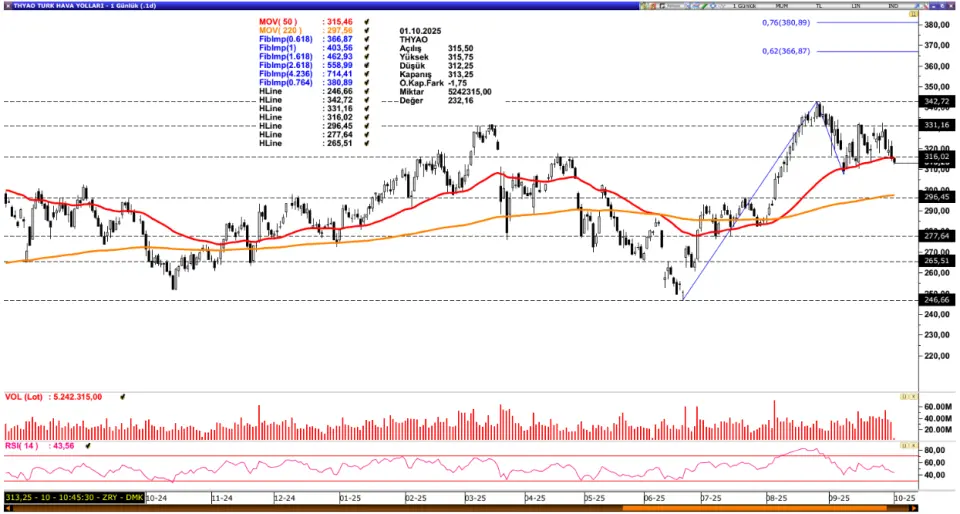 THYAO: Son süreçte 342,72 bölgesinden baskı gören THYAO, 50 günlük ortalama bölgesinde denge bulmaya çalışmaktadır. İlgili ortalamanın destek görevi görmesi halinde ilk etapta 331,16 seviyesi kritik eşik olarak izlenirken aşılması halinde baskı gördüğü 342,72 seviyesi ve 366,87 direncine doğru hareket akışını sürdürebilir. Olası baskılanmalarda 220 günlük ortalama (297,55) güçlü destek olurken altında fiyatlamalar realizasyon sürecini derinleştirebilir. Mevcut görünümde 220 periyotluk ortalama üzerinde kalındığı müddetçe iyimser beklentimiz ön planda yer almaktadır. Özellikle Ekim ayının sonunda başlayacak olan üçüncü çeyrek bilanço sezonunda mevsimsellik faktörünün ektisiyle havacılık sektöründe olumlu sonuçlar izlenebilir ve bu durumunda fiyatlama üzerine yansıması olasılık dahilinde yer almaktadır.