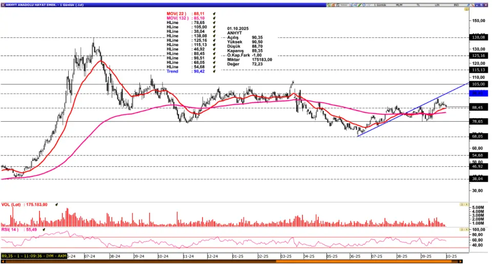 ANHYT: Son dönemde 88,45 seviyesindeki dirençten satış baskısı gören ANHYT, 78,65 seviyesinden bulduğu destekle toparlanma eğilimi göstererek hem 132 hem de 22 günlük hareketli ortalamaların yanı sıra 88,45 direncinin de üzerinde bir seyir izlemektedir. Bu bölgenin üzerinde kalıcılığın sağlanması durumunda, pozitif görünüm güç kazanarak fiyatın 98,42 seviyesine doğru ivmelenmesini sağlayabilir. Söz konusu direncin aşılması, yukarı yönlü hareketin devam etmesini destekleyerek 105,00 ve 115,13 seviyelerini gündeme getirebilir. Olası geri çekilmelerde 22 günlük ortalamanın geçtiği 88,45 seviyesi önemli bir eşik olarak öne çıkmaktadır. Bu seviyenin altına sarkılması durumunda ise düzeltme hareketi derinleşebilir ve fiyatlamalar yeniden 132 günlük ortalama ile 78,65 destek bölgesine doğru geri çekilebilir.