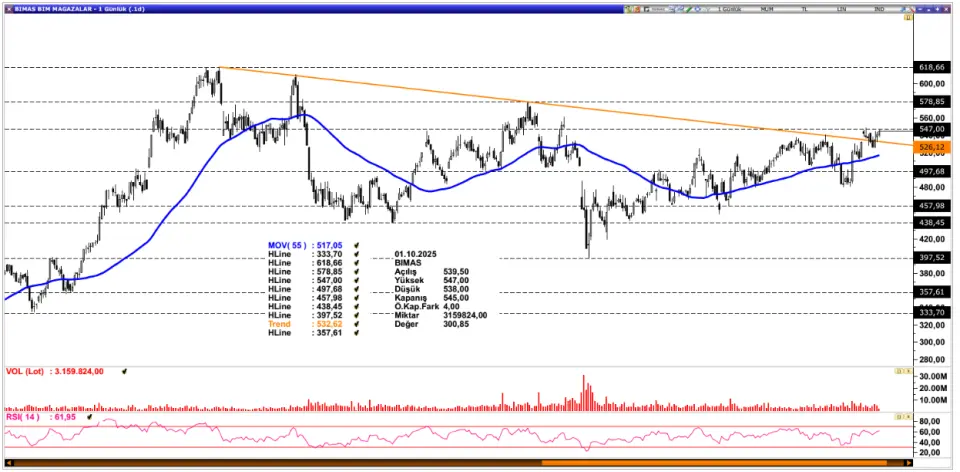 BIMAS: Uzun süredir turuncu renkli düşen trend çizgisinden baskı gören BIMAS, son dönemde yakaladığı pozitif ivme ile bu düşen trendin üzerine çıkarak yukarı yönlü fiyatlamalar sergilemeye başlamıştır. Bu trend çizgisinin üzerinde kalıcılığın sağlanması, teknik görünüm açısından olumlu bir tabloyu destekleyebilir ve alım iştahının artmasına zemin hazırlayabilir. Mevcut pozitif seyrin korunması halinde, hissede ilk aşamada 578,85 seviyesine doğru bir hareketin devam etmesi beklenebilir. Bu direncin de aşılması durumunda, TL bazlı tarihi zirve seviyesi olan 618,66’nın yeniden gündeme gelmesi mümkün olabilir. Olası baskılanma hareketlerinde trend çizgisi kritik destek olurken altında fiyatlamalar baskıyı 50 günlük ortalamaya doğru derinleştirebilir. Mevcut konjonktürde enflasyonda kademeli geri çekilmenin devamlılığı ve Merkez Bankası’nın da enflasyona uyumlu şekilde adım atacağı beklentileri hisse üzerinde destekleyici etki yaratabilir.