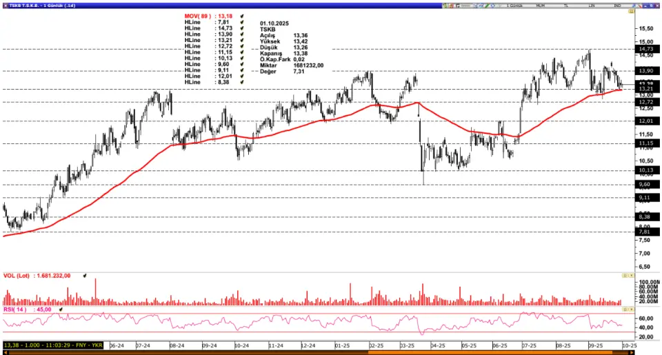 TSKB: 89 periyotluk ortalamadan aldığı destekle dikkatleri üzerine çeken TSKB iyimser beklentileri gündeme taşımaktadır. Hem bilanço sezonunun yaklaşması hem TCMB’nin faiz politikasına yönelik atığı gevşeme adımları bankacılık sektörüne Ekim ayında yeni bir ivme kazandırabilir. Böyle bir senaryoda TSKB uygun çarpanlara sahip olmasıyla da beraber bir adım öne çıkabilir. Teknik görünümde yukarı yönlü hareketin devamıyla 13,90 seviyesine doğru hareket akışı izlenebilir. 13,90 seviyesinin aşılması ise 14,73 seviyesine doğru yeni bir hareket alanı oluşturabilir. Olası geri çekilmelerde 89 periyotluk ortalama güçlü destek bölgesi olarak takip edilirken altında kalıcı fiyat hareketleri izlenmesi negatif görünümü beraberinde getirebilir ve 12,01 seviyesine doğru baskıyı gündeme taşıyabilir.