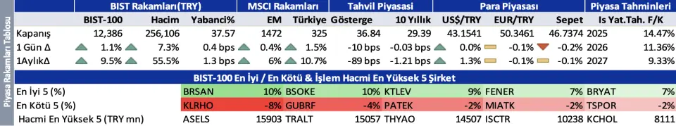 2025 hedeflerini aşan ve 2026 yılına yönelik güçlü hedefler açıklayan Emlak GYO'nun pozitif tepki vermesini bekliyoruz. ATP haberine pozitif tepki görebiliriz. Ama değerleme etkisi hesaplayamıyoruz. Türk Metal Sendikası ve Metal Sanayicileri arasındaki görüşmelerde uzlaşma sağlanamamasına özel bir piyasa tepkisi beklemiyoruz.