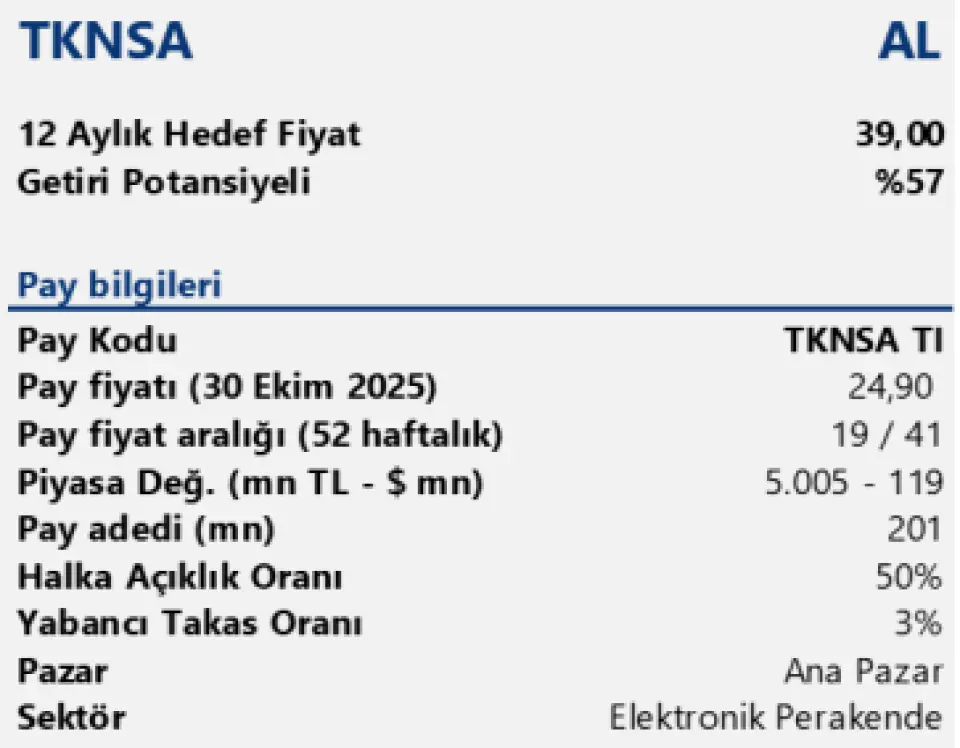 Tacirler Yatırım TKNSA hissesine 39 TL hedef fiyat verdi ve %57 kazanç potansiyeli beklediğini açıkladı. Kurum hisseyi model portföyünde de tutmaya devam ediyor.